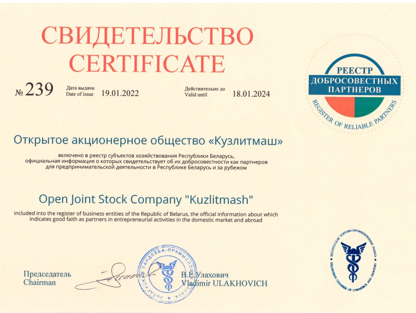 ААТ "Кузлітмаш" уручана пасведчанне аб уключэнні ў Рэестр добрасумленных партнёраў, якое выдаецца Беларускай гандлёва-прамысловай палатай.