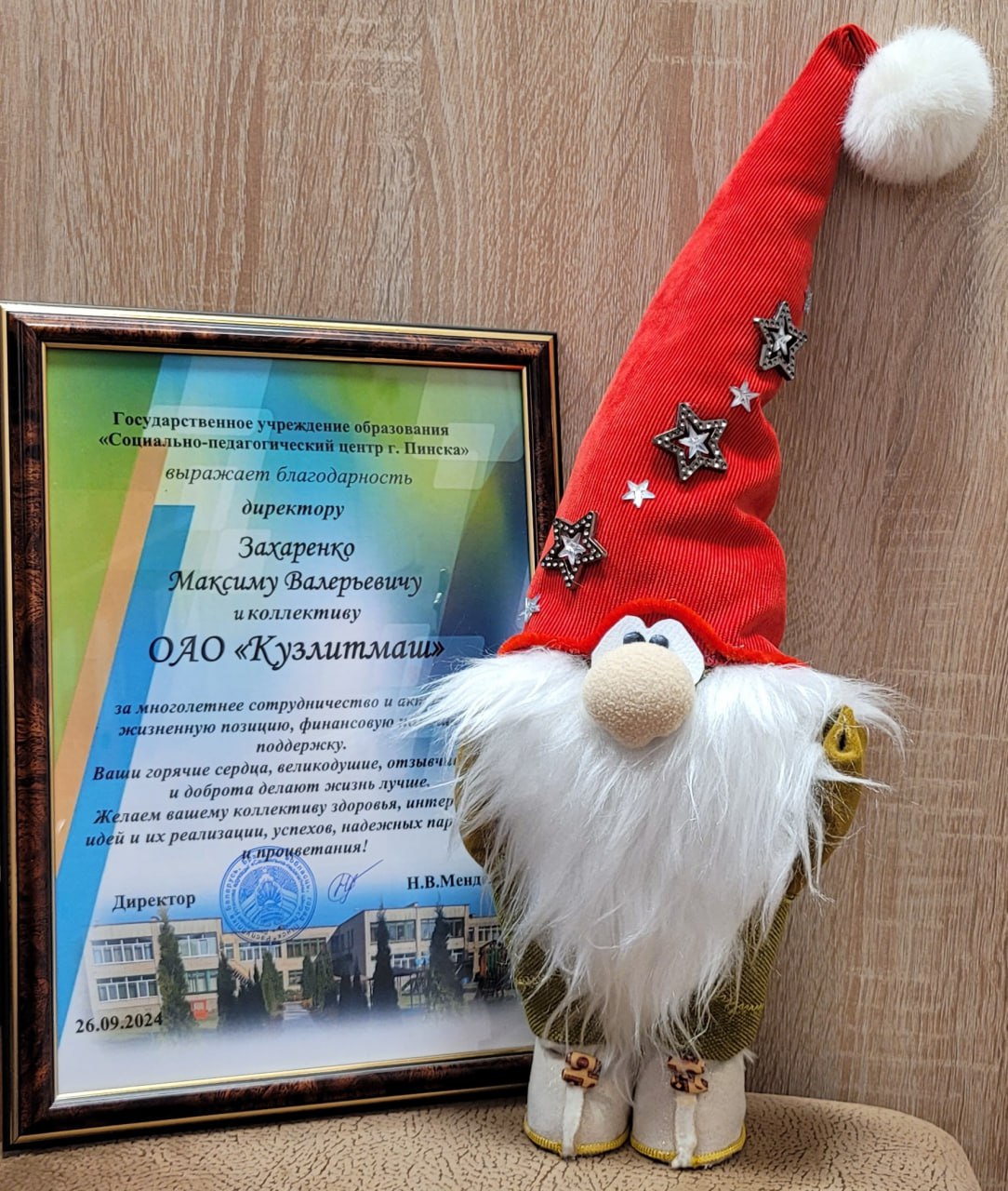 ГУО "Социально-педагогический центр г. Пинска" выражает благодарность директору и коллективу ОАО "Кузлитмаш" за многолетнее сотрудничество и активную жизненную позицию, финансовую помощь и поддержку.