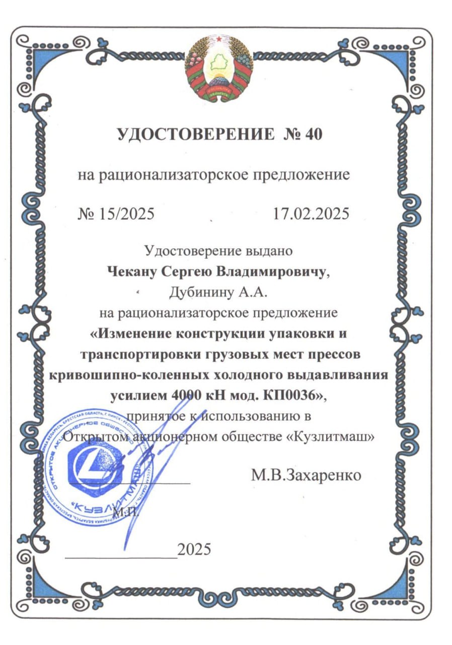 В целях достижения высокого качества продукции и в соответствии с действующим в Обществе «Положением о рационализаторской деятельности в ОАО «Кузлитмаш» признано рационализаторским предложение ведущего специалиста по маркетингу Чекана Сергея Владимировича и главного конструктора Дубинина Александра Анатольевича по изменению конструкции упаковки и транспортировки грузовых мест прессов кривошипно-коленных холодного выдавливания усилием 4000кН мод. КП0036.