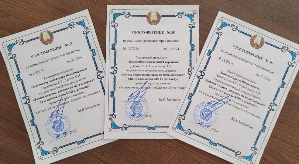 В соответствии с планом мероприятий по обеспечению выполнения Республиканского плана мероприятий по проведению в 2024 году Года качества, в целях достижения высокого качества продукции и в соответствии с действующим в Обществе «Положением о рационализаторской деятельности в ОАО «Кузлитмаш» в ІІІ кв. 2024 года признаны рационализаторскими и приняты к использованию 2 рационализаторских предложения: