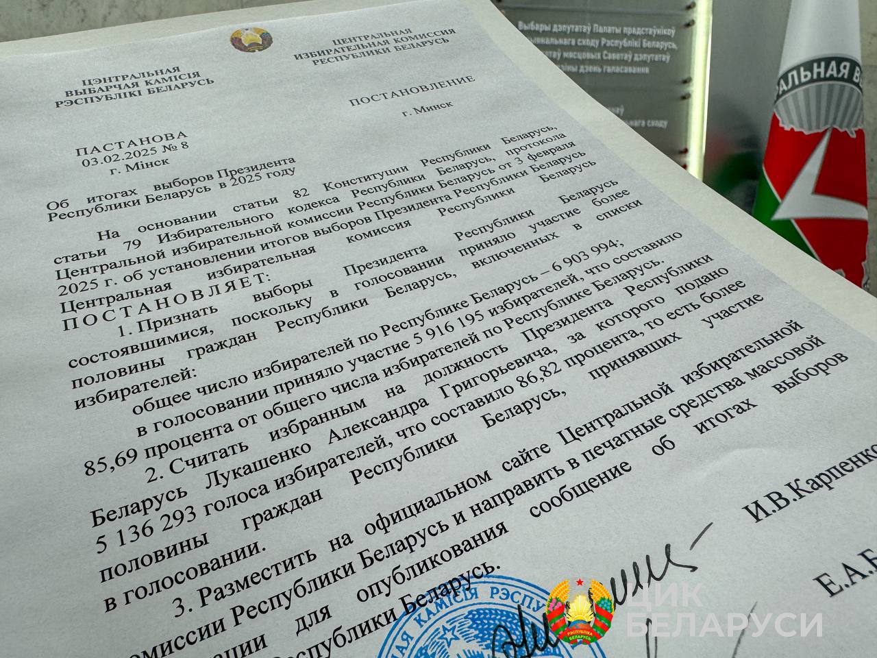 Президентом Республики Беларусь избран ЛУКАШЕНКО Александр Григорьевич, за кандидатуру которого подано 5136293 голоса избирателей, что составило 86,82 %, то есть более половины граждан Республики Беларусь, принявших участие в голосовании.