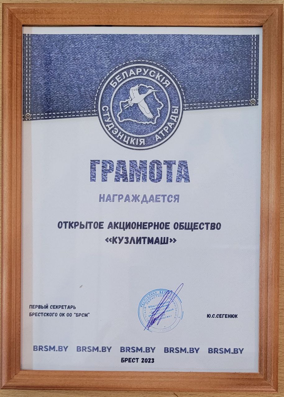 По итогам областного этапа республиканского конкурса "Трудовой семестр 2023" ОАО "Кузлитмаш" стало победителем в номинации "Лучший наниматель".