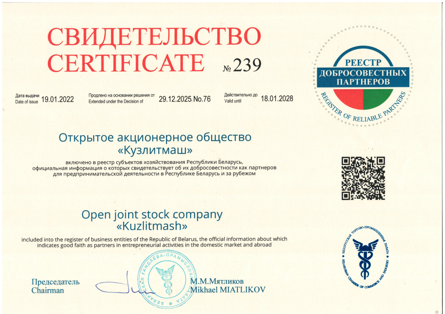 Свидетельство о включении в реестр добросовестных партнеров
