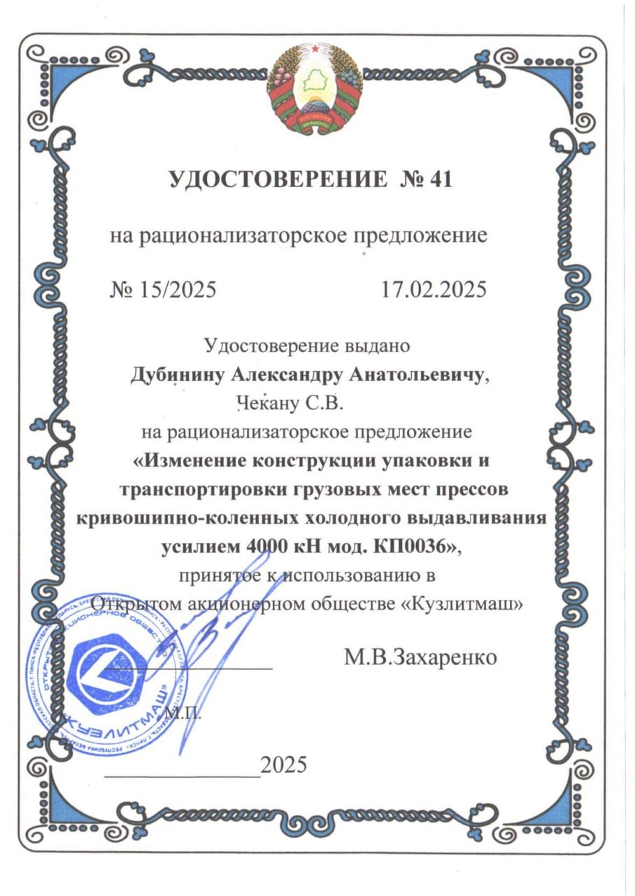 В целях достижения высокого качества продукции и в соответствии с действующим в Обществе «Положением о рационализаторской деятельности в ОАО «Кузлитмаш» признано рационализаторским предложение ведущего специалиста по маркетингу Чекана Сергея Владимировича и главного конструктора Дубинина Александра Анатольевича по изменению конструкции упаковки и транспортировки грузовых мест прессов кривошипно-коленных холодного выдавливания усилием 4000кН мод. КП0036.
