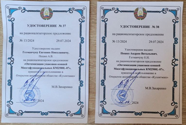 В соответствии с планом мероприятий по обеспечению выполнения Республиканского плана мероприятий по проведению в 2024 году Года качества, в целях достижения высокого качества продукции и в соответствии с действующим в Обществе «Положением о рационализаторской деятельности в ОАО «Кузлитмаш» в ІІІ кв. 2024 года признаны рационализаторскими и приняты к использованию 2 рационализаторских предложения: