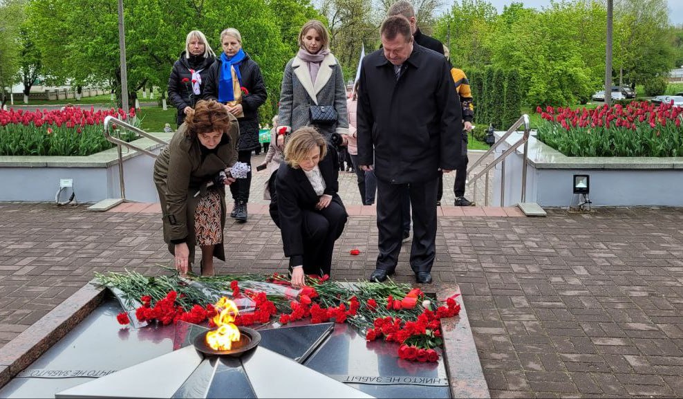 Память погибших воинов-освободителей города Пинска участники митинга почтили минутой молчания. К Братской могиле воинов-освободителей в знак уважения и благодарности были возложены живые цветы.