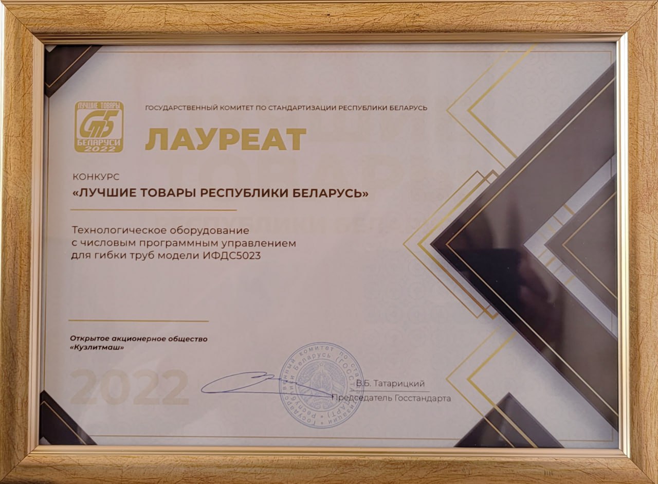 Открытое акционерное общество «Кузлитмаш» приняло участие в конкурсе «Лучшие товары Республики Беларусь – 2022 года» и удостоилось звания лауреата конкурса с оборудованием «Технологическое оборудование с числовым программным управлением для гибки труб модели ИФДС5023»