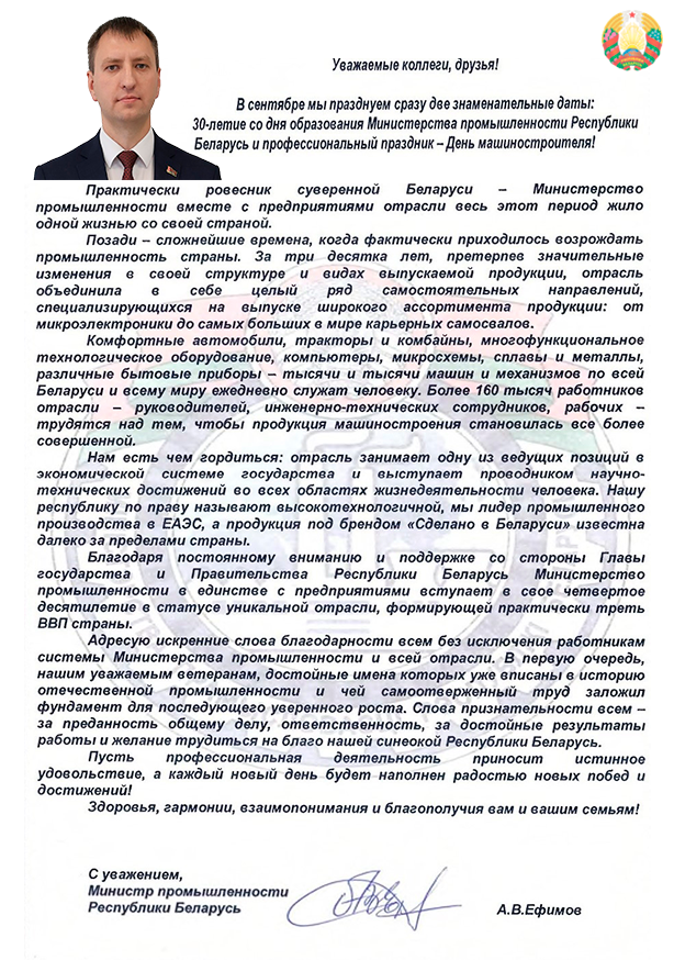 Поздравление Министра промышленности Республики Беларусь Александра Ефимова по случаю 30-летия Министерства промышленности и Дня машиностроителя