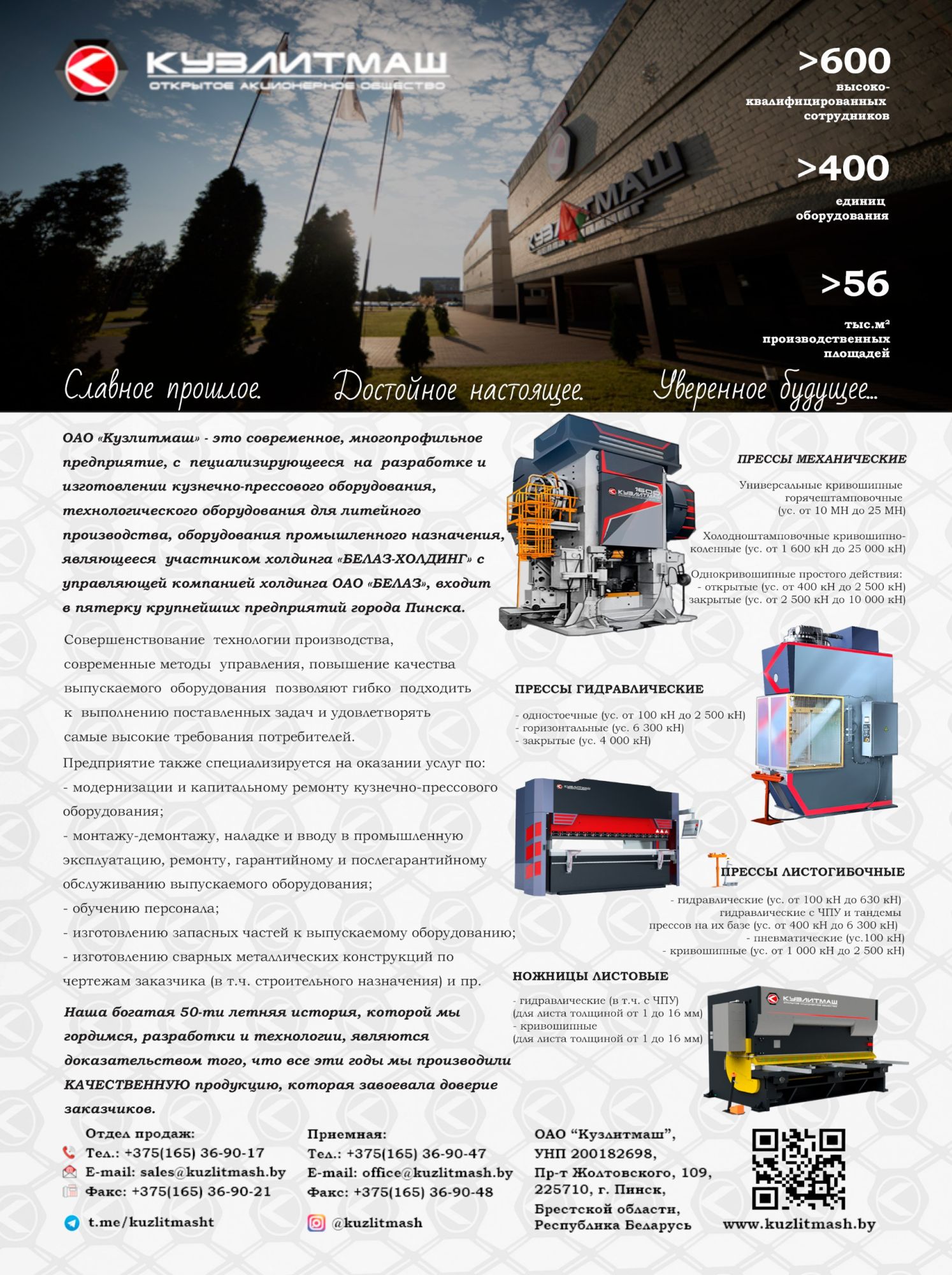 В целях широкого информирования о деятельности предприятия, выпускаемой продукции, динамичном развитии и профессионализме коллектива, ОАО "Кузлитмаш" опубликовало статью в специальном выпуске международного промышленного журнала "Знак Качества" №1/2 (84), 2025.