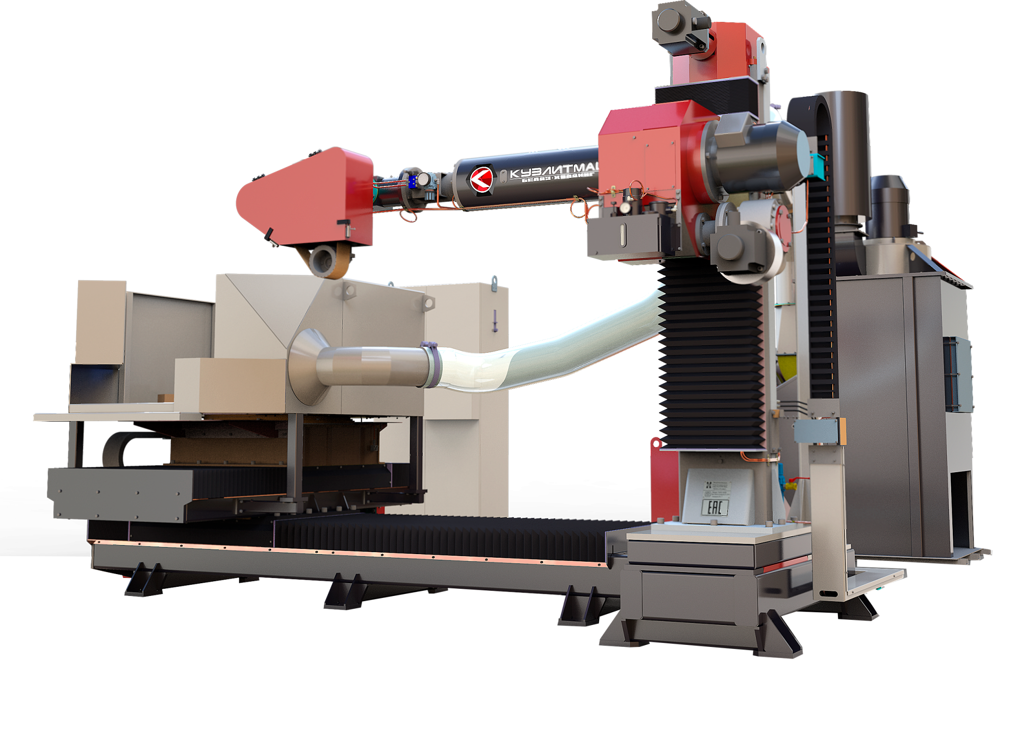 Машина представляет собой промышленное оборудование, имеющее 5 управляемых ЧПУ осей (X, Y, Z, A, B), и состоящее из следующих основных частей: основание, состоящим из двух соединенных между собой рам; механизм продольного перемещения; стойка вертикальная; рама поперечная; стол поворотный; привод головки обдирочной; головка обдирочная; система смазки; пневмооборудование; установка пылеудаления; кожух защитный; узел кабельных цепей; электрооборудование.